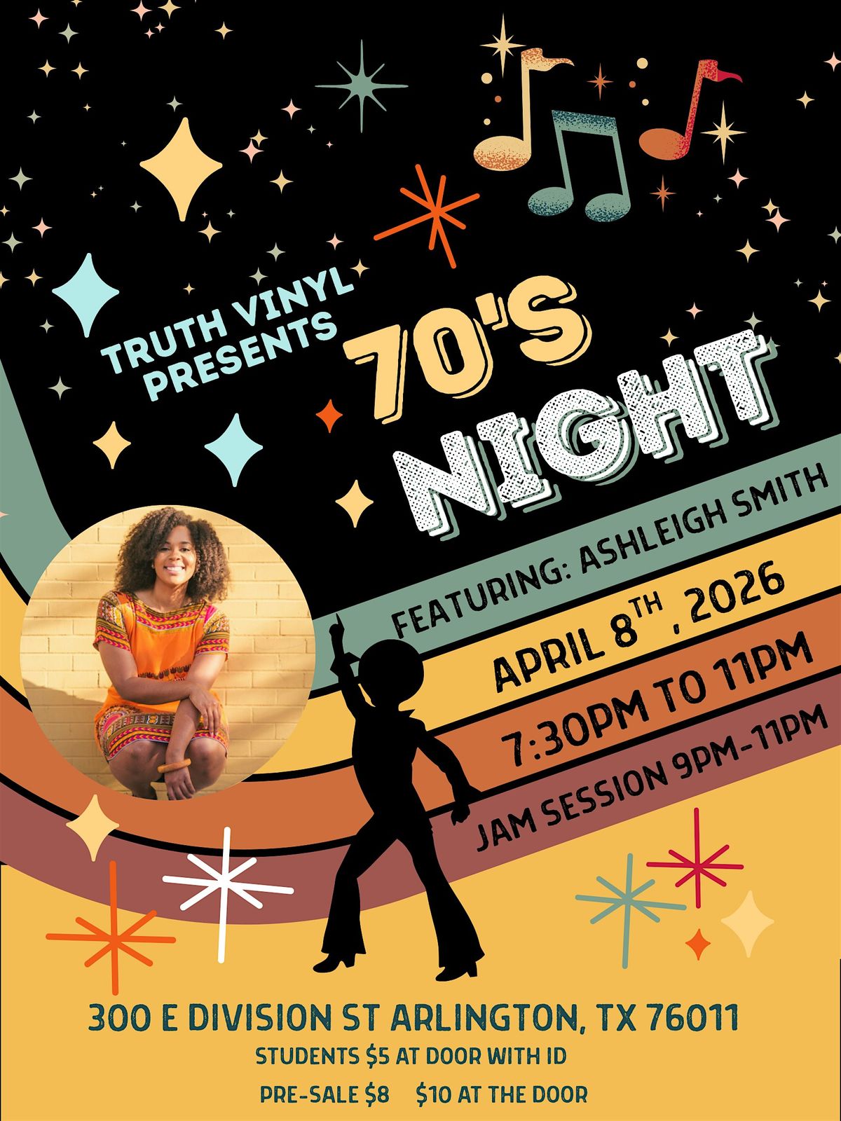 Get ready to boogie down at 70s Night with the amazing Ashleigh Smith live in person! Dust off those bell bottoms, tie-dye shirts, and platform shoes for a groovy night full of fun vibes and classic tunes. It's the perfect chance to relive the funky era or discover the magic of the ’70s firsthand.