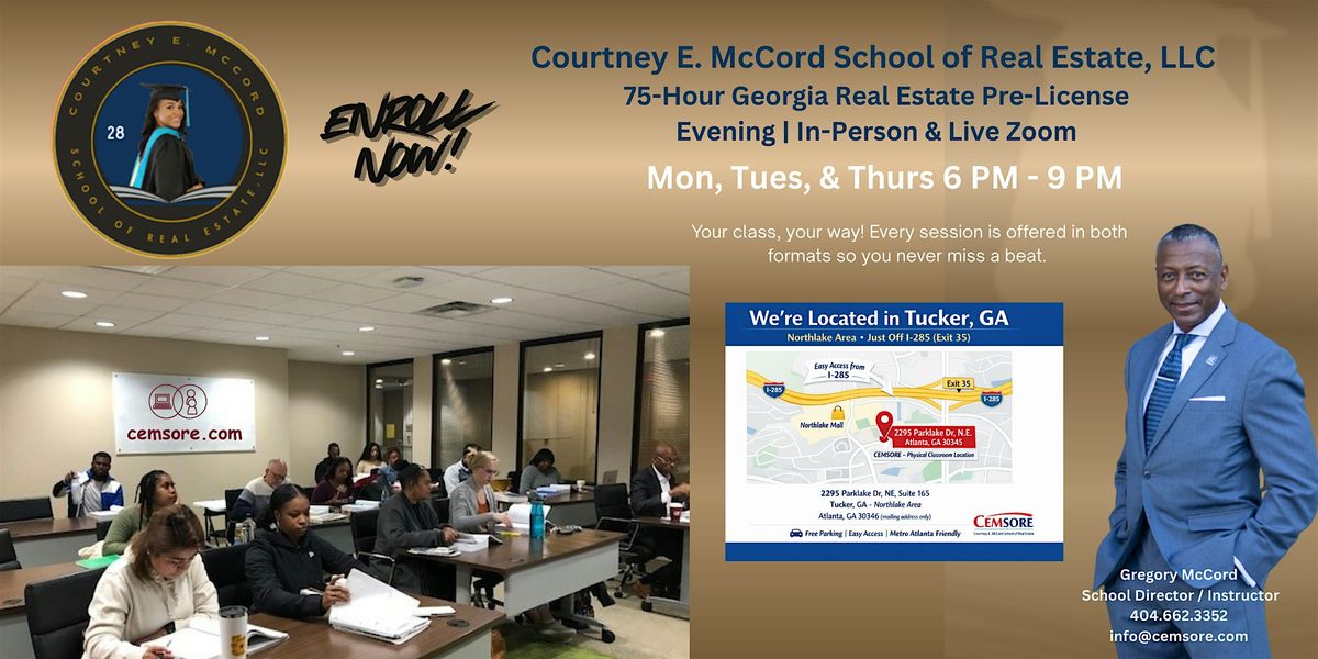 Start your real estate career! Complete the 75-Hour Georgia Pre-License course Evening LIVE In-Person or via ZOOM | 6 PM - 9 PMAbout this Event