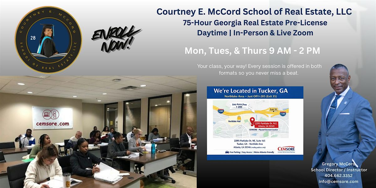 Daytime Class: Apr 16 - May 21 | Mon/Tues/Thurs 9 AM–2 PM | Start your career with Georgia’s trusted 75-Hour Pre-License Course. Enroll NowAbout this Event