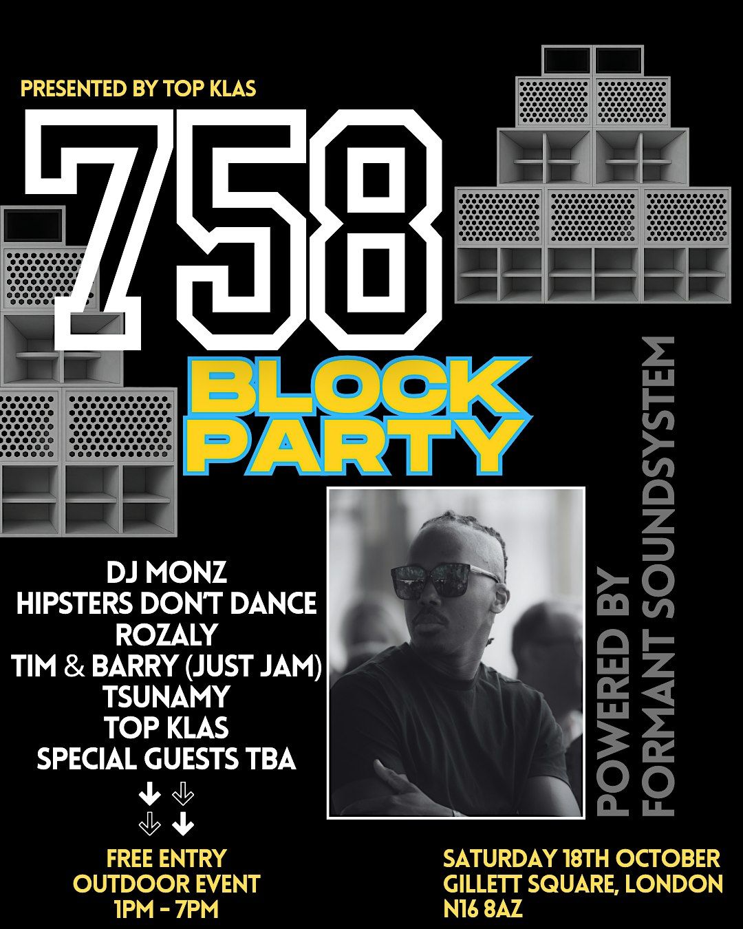 All roads lead to Dalston, London, @djtopklas presents ‘758 Block Party’, on the famous Gillett Square alongside @djmonz @hddldn @rozaly @tsunamy @timandbarry & MORE, powered by the good folks @formantsoundsystem