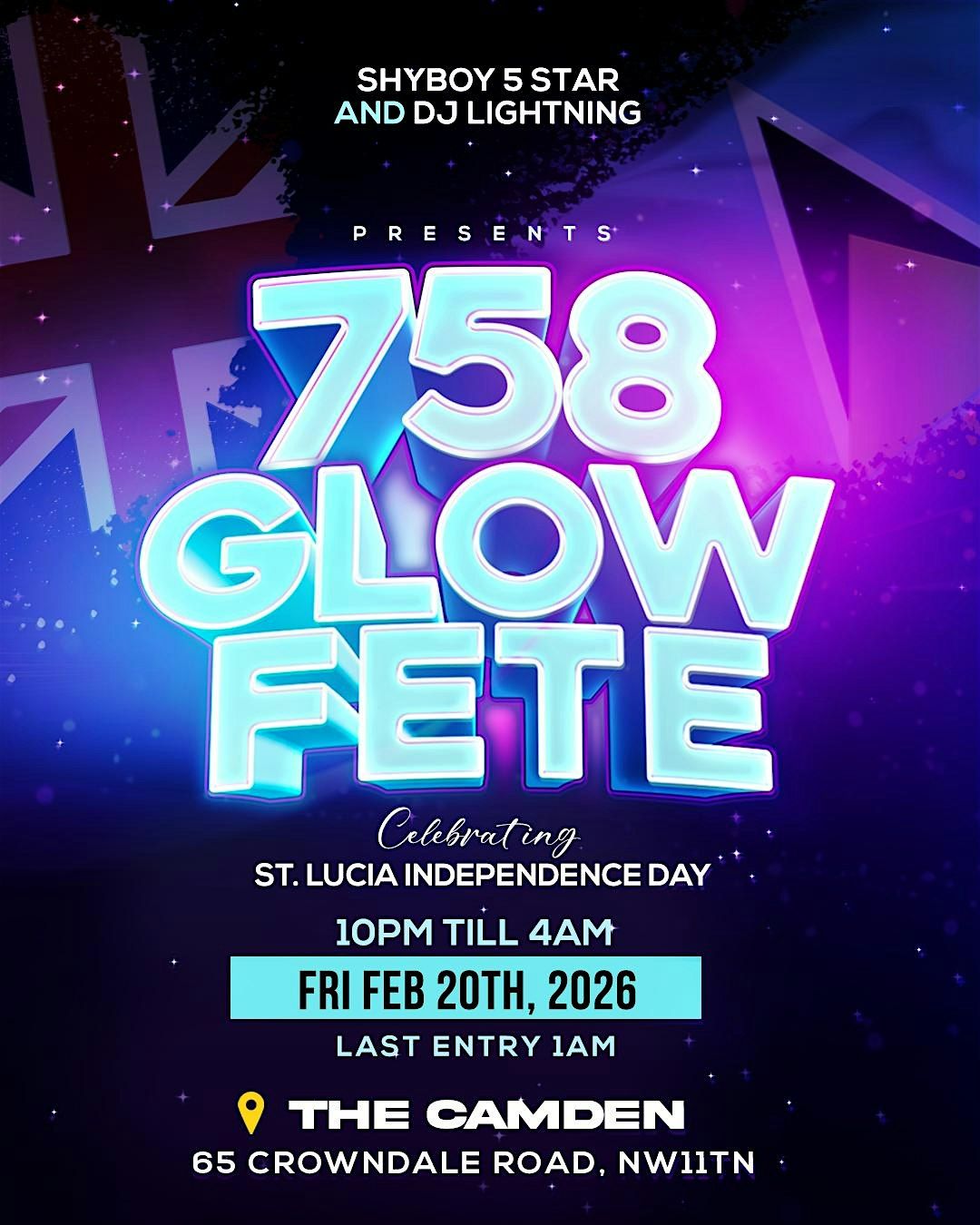 Join us in person as we celebrate St Lucia Independence Day. A night full of vibes, lights, and fun! 758 GLOW FETE is all about celebtation, glowing up and letting loose with the best in dennery segment music, the St Lucian diaspora, and a bright atmosphere that'll light up your night. Don’t miss out on the ultimate glow party experience – bring your crew, your flags and st lucian colours, glow accessories will be provided.