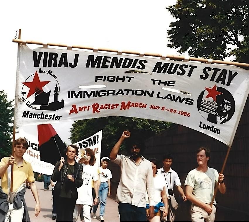 Photo credit: Viraj Mendis on the People's March from Manchester to London, July 1986. Courtesy of Chris Procter. The Viraj Mendis Anti-Deportation and Sanctuary Collection, Ahmed Iqbal Ullah RACE Centre, Manchester, GB3228.118.