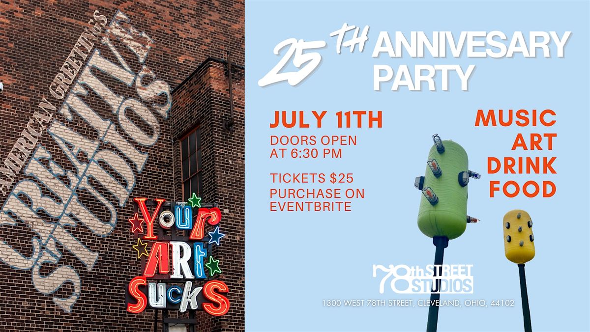 Join us for an unforgettable evening as we celebrate 25 years of innovation, growth, and partnership at 78th Street Studios. We invite you to mark this significant milestone with us alongside our many business collaborators, vendors, and resident artists as we celebrate our past, present, and future with an evening of music, food, and community! This exclusive event honors Dan Bush, the visionary owner and developer who founded and grew 78th Street Studios into the largest arts complex in Northeast Ohio.