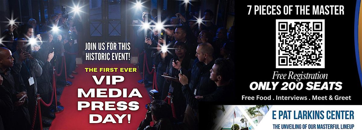 Welcome to 7PM Media Press Day - You Saw fit! 7 Pieces of the Master! Join us for an exciting event where we showcase the Greatest Line-up for 7 PM from talented artists, pastors, media team, and more. This in-person event will be held at the E. Pat Larkins Community Center. Get ready to be inspired and amazed by the creativity on display. Don't miss out on this unique opportunity to see our speakers and artists up close and personal wth over 50 pastors and Many other Artists in our community. Meet them up close and personal. Food, Interviews, and the Subject reveal will launch on an awesome night. Please mark your calendars and celebrate the power of media with us!