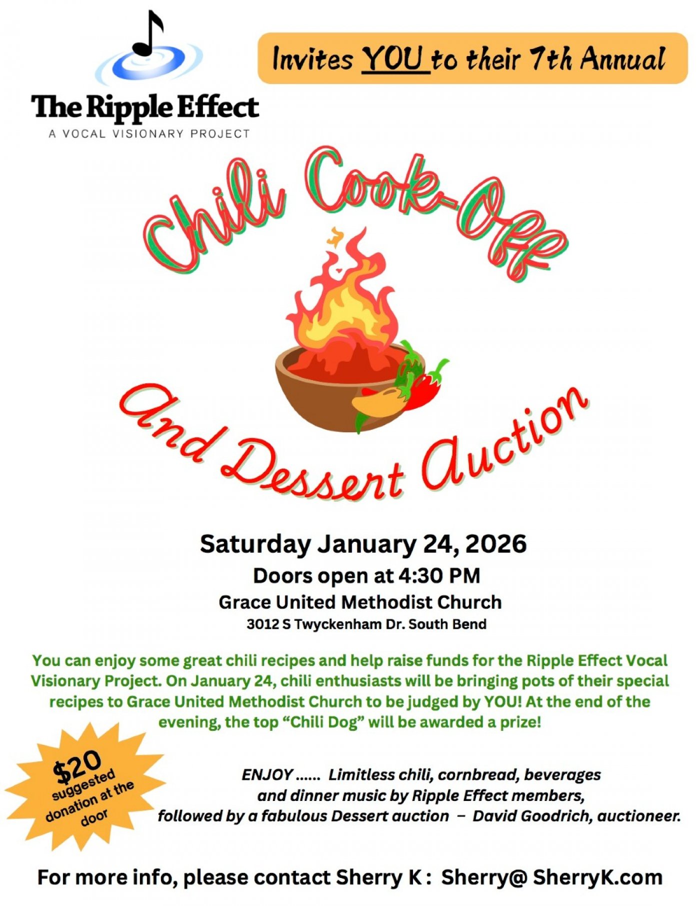 7th Annual Chili Cook-off/Dessert Auction Fundraiser -- You are invited to a special "sweet and heat" event to help raise funds for The Ripple Effect Vocal Visionary Project, Inc! On January 24, chili enthusiasts in the area will be bringing pots of their special homespun recipes to Grace United Methodist Church to be judged by the public. At the end of the evening, the Top Chili Dog will be awarded a prize! The $20 suggested donation at the door includes limitless chili, cornbread, beverage, dinner music (provided by The Ripple Effect members, of course!), door prizes, and the opportunity to participate in a dessert auction. All proceeds will go to The Ripple Effect general operations. Grace United Methodist Church is located at 3012 S Twyckenham Dr, South Bend, and the doors open at 4:30. For more info, please contact Sherry K: [email protected].