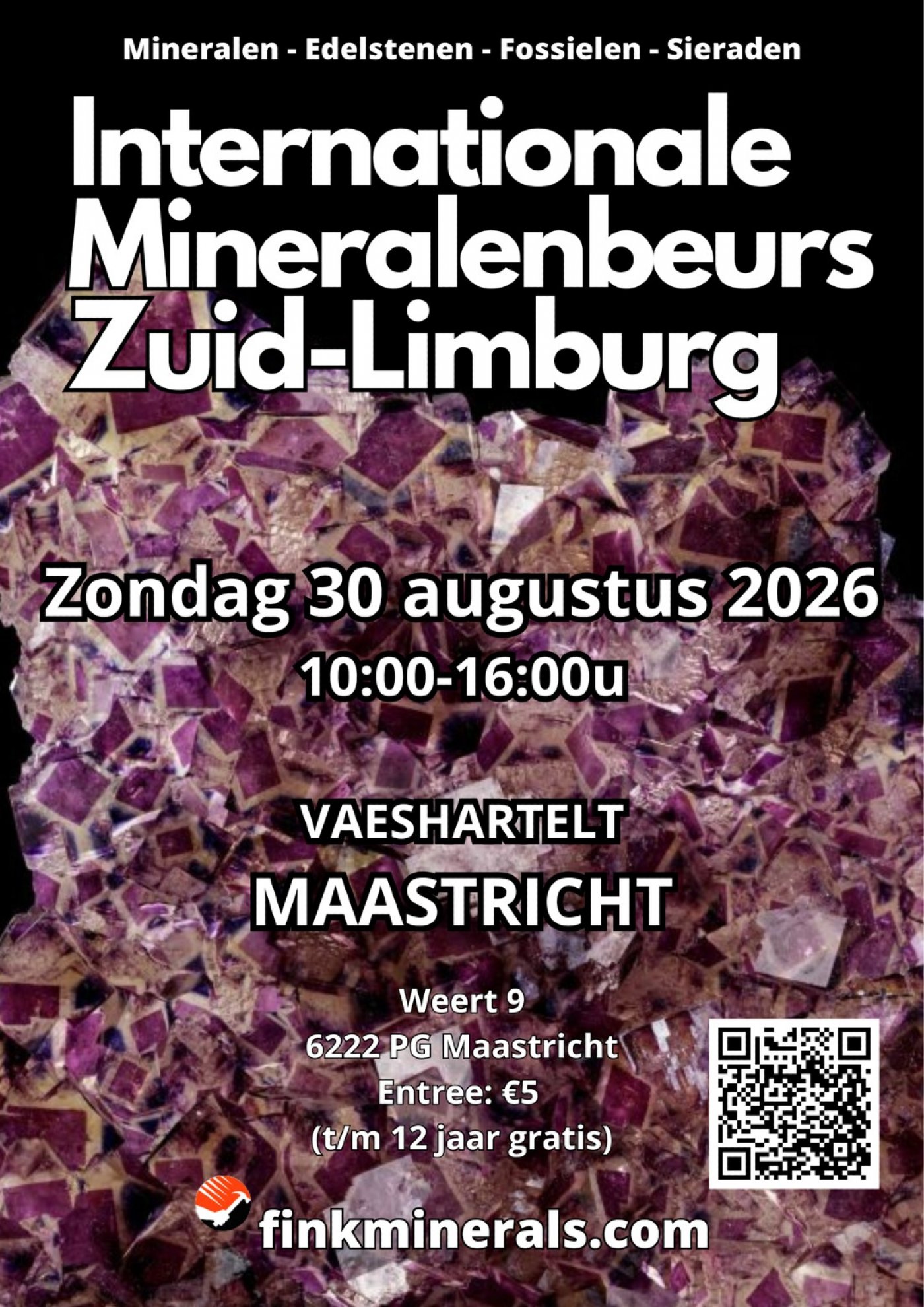 On Sunday, August 30, the doors of Vaeshartelt Castle will open once again for Maastricht's premier mineralshow: the International Mineralshow South Limburg. Here you will meet traders and enthusiasts of minerals, fossils, and jewelry from the Netherlands, Belgium, and Germany.