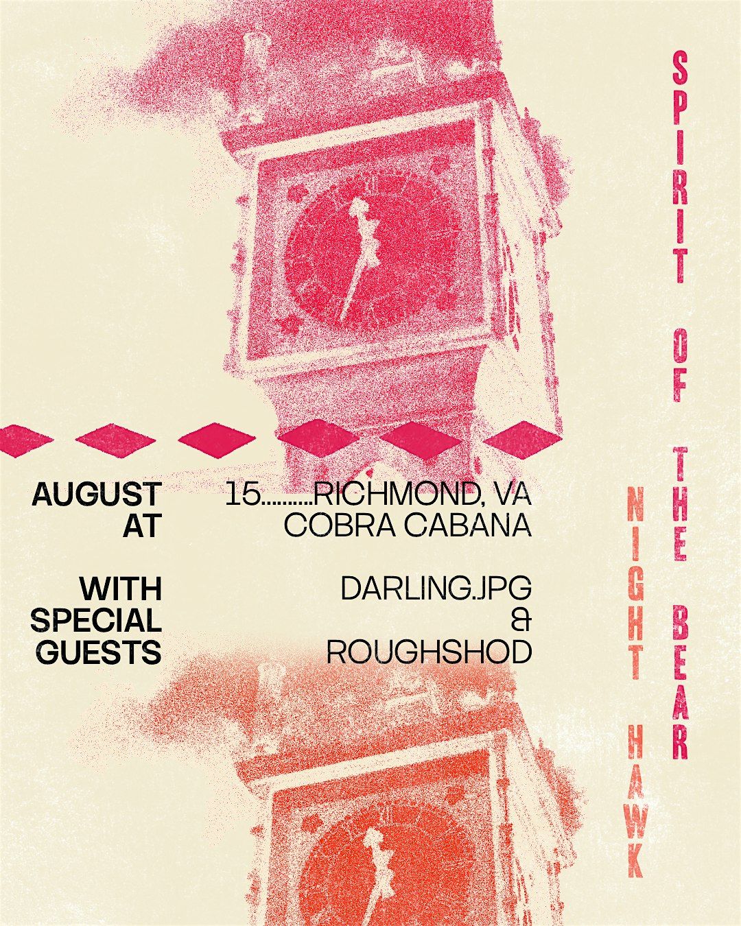 Get ready for an epic night at COBRA CABANA featuring NIGHT HAWK, SPIRIT OF THE BEAR, DARLING.JPG, and ROUGHSHOD! This is an in-person event packed with great vibes and killer tunes. Don’t miss out on a night full of awesome music and good times. Bring your crew, your dancing shoes, and let’s make some memories!