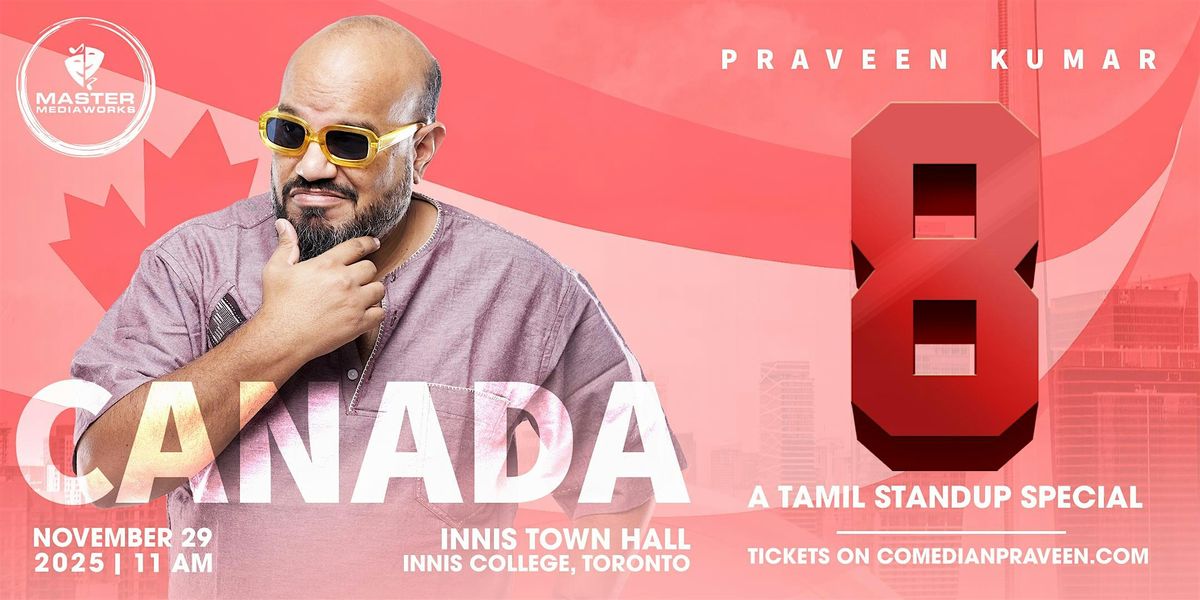 Praveen Kumar (PK), known for his highly successful tamil stand up comedy shows such as "36 Vayathiniley", "Kancheepuram Mapla," and "Family Man," is set to captivate the audience in Toronto with his "8" on Nov 29, 2025, after his widely appreciated shows all over the world.