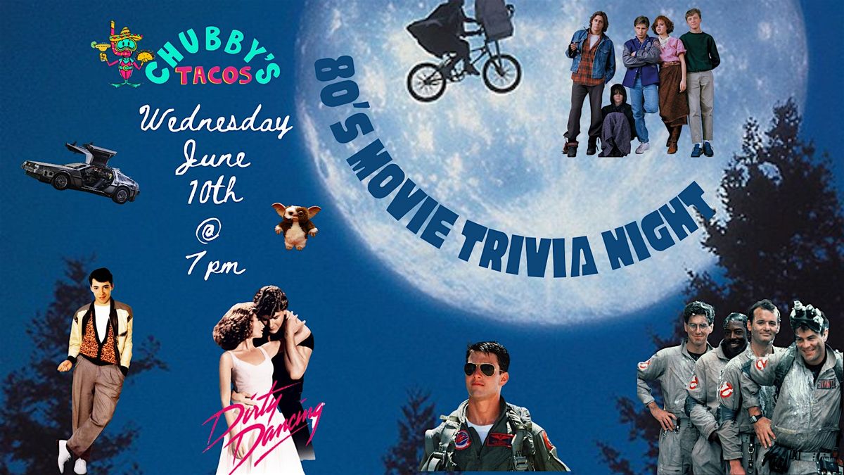 Wax on, wax off to Chubbys Tacos on Wednesday, June 10th, starting 7:00 pm for 80s Movies Trivia for FIVE unique and challenging rounds on the decade of movies that left its mark.