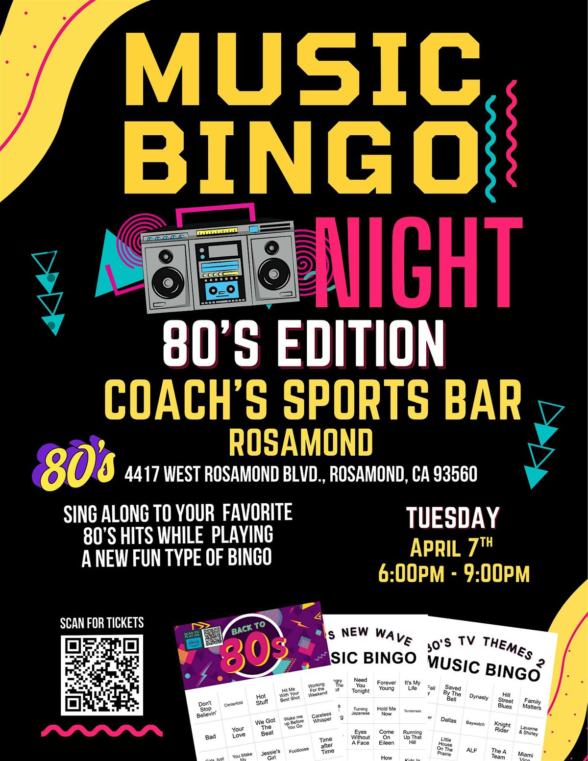 Hey Music Bingoers! 80's Music Bingo Night will be in Rosamond Tuesday. We’ll be at Coach's Sports Bar & Grille.