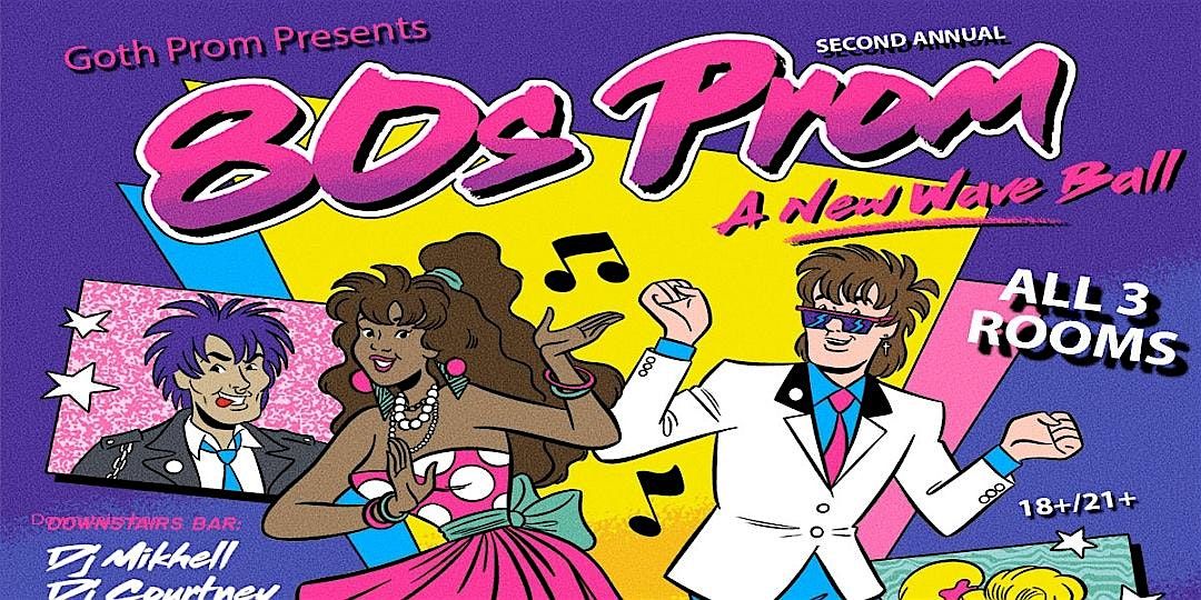 3 rooms -18+/21+ - Two free "Prom Photo" portrait booths - Full Prom decorations & ambiance - Prom King & Queen contest - Balloon drop - 4 rooms - 3 dance floors - 4 DJ's - Gift bags & goodies for outstanding outfits - Dark 80s - New Wave - New Romantic - Alt 80s - Pop 80's - ALL 80s!!!