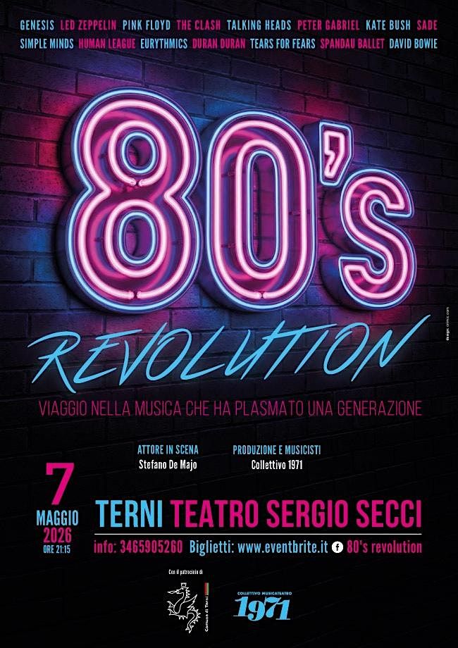 Giovedi 7 Maggio ore 21,15Si intitola ‘80's REVOLUTION - "Viaggio nella musica che ha plasmato una generazione" IL NUOVO SPETTACOLO con cui il collettivo ‘Musica Teatro 1971’ torna ad esibirsi davanti al suo pubblico. Dopo il successo nei vari spettacoli prodotti anche in sinergia con importanti compagnie e promoter teatrali Italiani in vari teatri e location del centro Italia, il Collettivo Musicateatro 1971 porta in scena con ‘80’s REVOLUTION che racconta la rivoluzione musicale che animò le scene dalla fine degli anni ’70 a tutta la decade degli ’80.