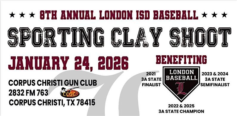 The 8th Annual London ISD Baseball Sporting Clay Shoot fundraiser is taking place January 24th, 2026, at @ The Corpus Christi Gun Club. This event is the main source of fundraising for our middle school and high school baseball teams and serves to fund all the teams throughout the year. Our varsity boys have made 5 straight state tournament appearances and look forward to playing in Round Rock again this season.Funds raised at this event will be used to purchase uniforms, equipment, meals, and hotel rooms for tournaments and directly supports the success our teams have on the field. We hope that you will be able to enter a team this year, but if you are not able to enter a team, we hope you will consider a sponsorship. Sponsorships start from $350 for a station sponsorship and go up to $1,600 for a gold sponsor which includes a team entry, station sponsorship, and golf cart rental.Attached is the flyer with general information. You can click the link below to access the flyer and registration form. You can enter and pay online or feel free to print and mail your entry to the address at the bottom of the registration form. There is also a QR code available for scanning.