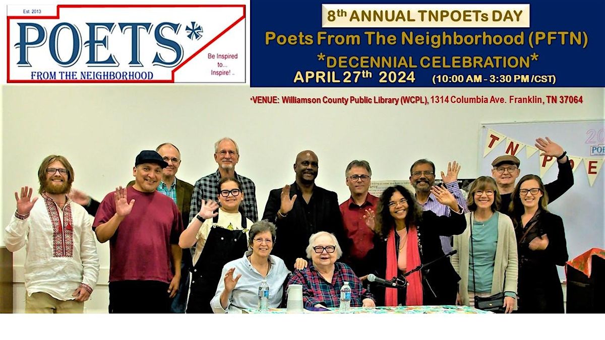 PFTN’s On-site Decennial Celebration & 8th Annual TN POETs DAY -2024 is held on April, 27th, Saturday (10:00 AM – 3:30 PM) at the Williamson County Public Library (WCPL – Main Branch), Franklin, TN. Pls, see attached Flyer for Schedule & more details!