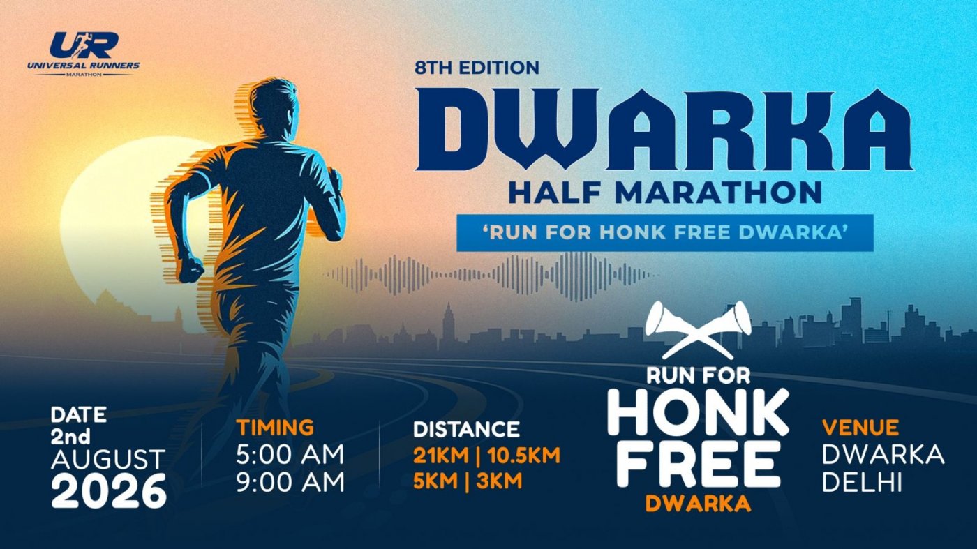 URM is organizing the 8th Edition of Dwarka Half Marathon ”Run For Honk Free Dwarka “ on Sunday ,2nd August 2026 URM is organizing this event with a view to create awareness about the ill-effects of noise pollution and to promote judicious use of horn to ensure “Honk Free Dwarka.”