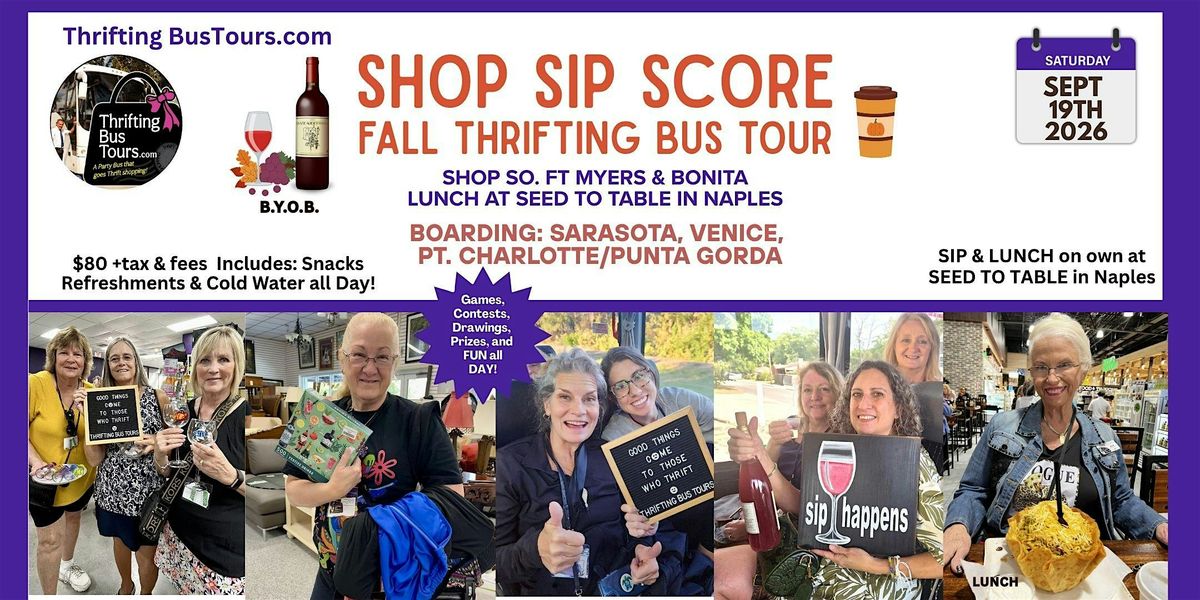 Get ready for a fun-filled day of treasure hunting, laughter, and stylish steals! Join us for our Shop, Sip & Score Fall Thrifting Bus Tour as we head to some of the best resale shops in Fort Myers & Bonita Springs—where the finds are fabulous and the deals are even better.