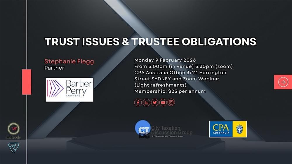 Join us for a session with Stephanie Flegg from Bartier Perry on the topic of Trust Issues & Trustee Obligations.