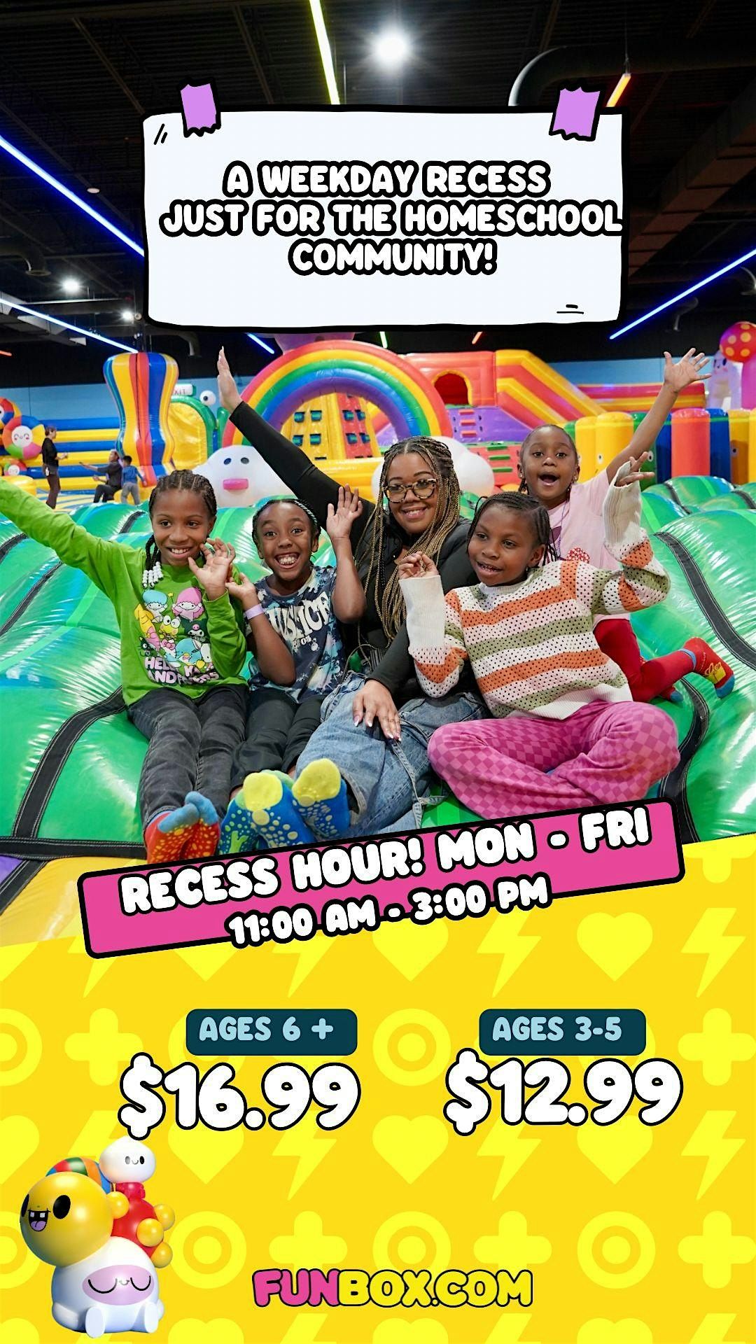 Weekday Recess at Funbox Bowie is designed for families looking for flexible, daytime fun in a welcoming and inclusive environment. Whether you’re part of a homeschool community, a microschool or learning pod, have little ones not yet in school, or are simply looking for a weekday outing with friends—this experience is for you.