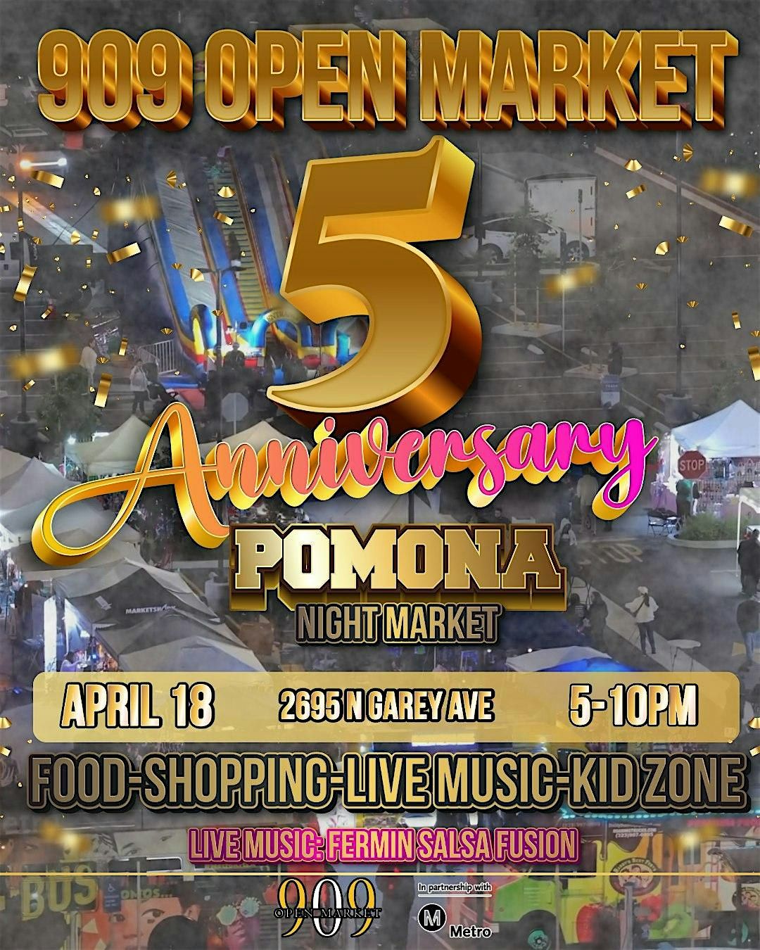 909 Open Market 5 Year Anniversary! April 18 in Pomona. Food, shopping, live salsa music & kid zone. 5–10PM. Free entry—don’t miss it!