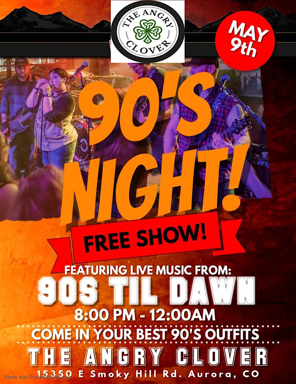 The Angry Clover is throwing a 90’s bash! Come dressed in your best 90's outfit and rock the night away with 90s Til Dawn, Denver's Premier 90's cover band. Four hours of music, fun, prizes, and nostalgia await! Show starts at 8:00pm.