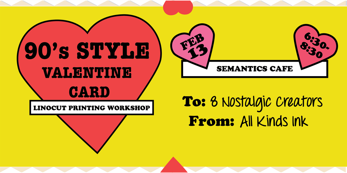 Step back into the nostalgia of handmade Valentines at this 90s-style linocut printing workshop hosted by All Kinds Inkat Semantics Café on February 13th from 6:30–8:30 PM.
