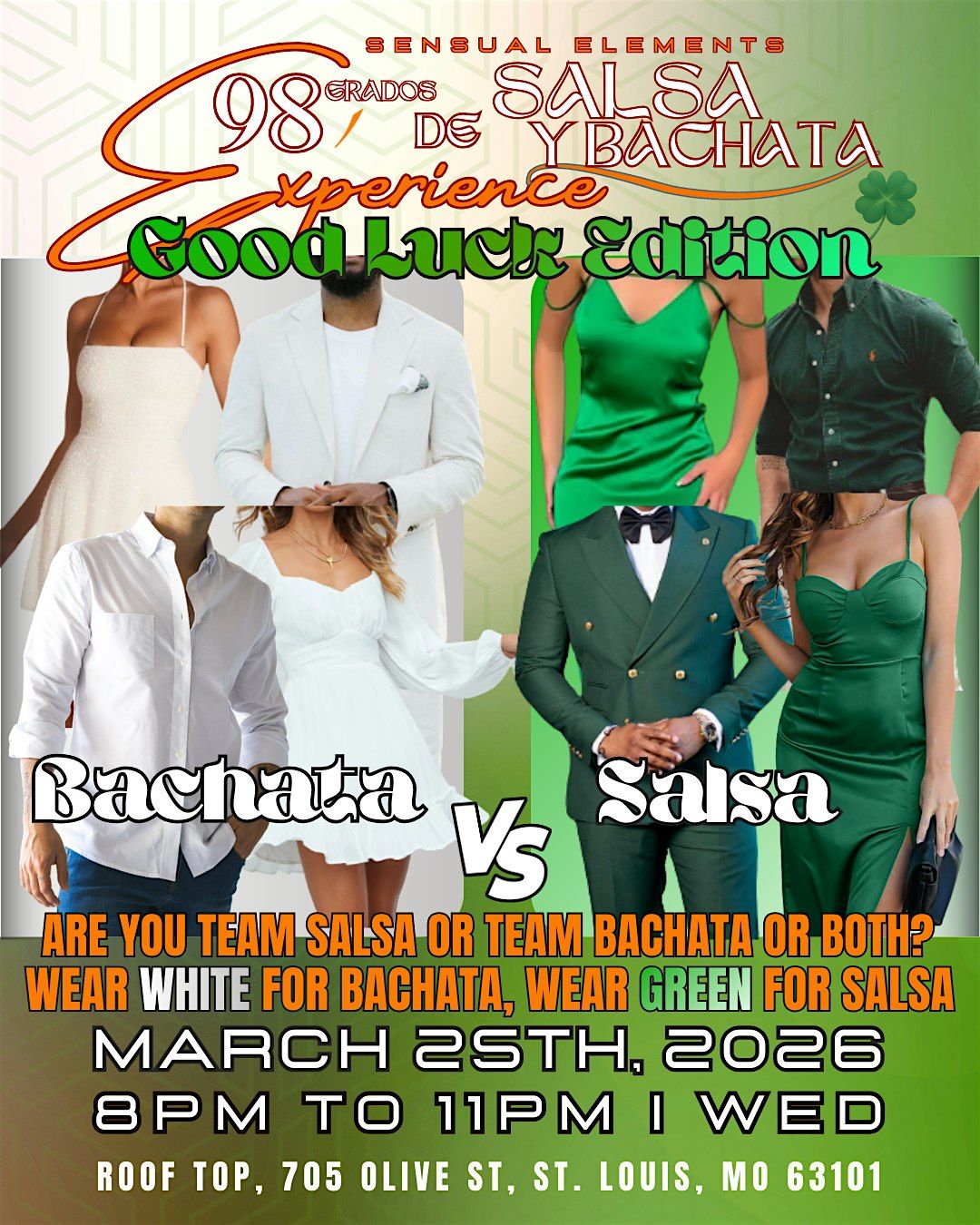Get ready to heat up the dance floor with the hottest salsa and bachata tunes at 98 Grados - Good Luck Edition