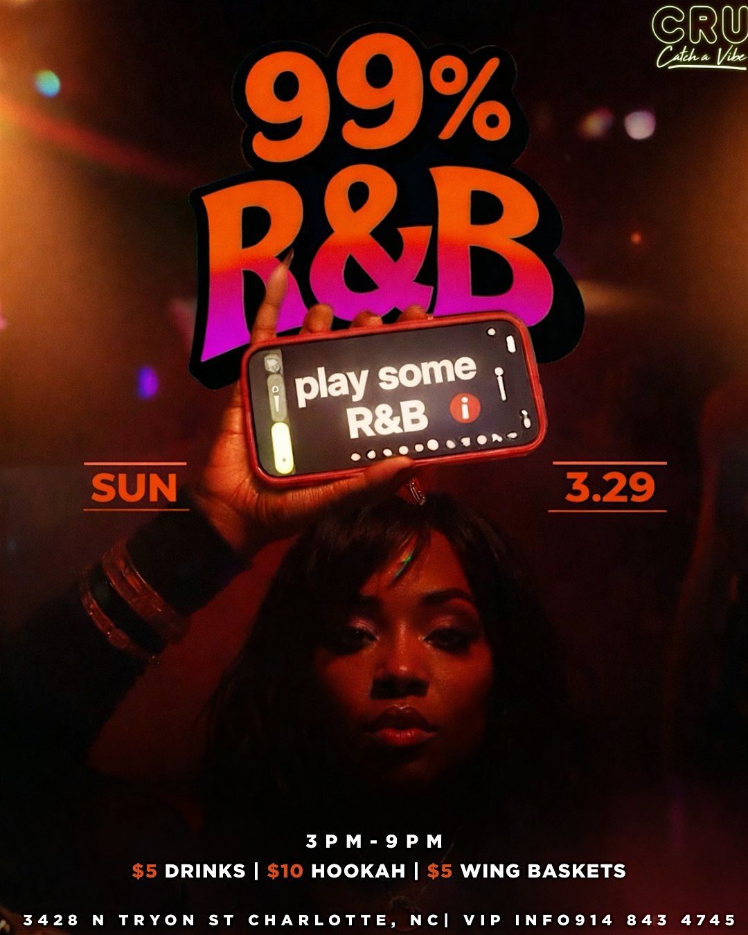 Join us at CRU – Catch A Vibe for 99% R&B, a day party dedicated to the smoothest R&B hits from the 90s, 2000s, and today. Expect nothing but sing-along anthems, good vibes, great drinks, and the best crowd in Charlotte.