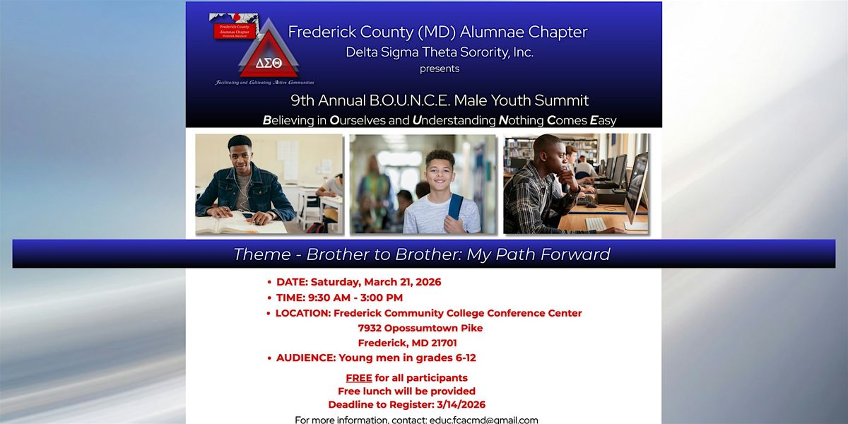 Frederick County (MD) Alumnae Chapter of Delta Sigma Theta Sorority, Inc.,in partnership with Frederick Community College, invites you to join us for our 9th Annual B.O.U.N.C.E. (Believing in Ourselves and Understanding Nothing Comes Easy) Male Youth Summit. This year's summit will be held in-person at the Frederick Community College Conference Center. The event will feature a series of workshops filled with insightful conversations led by male panelists; interactive games; a continental breakfast and lunch and wrap up with some fun, innovative post-event activities.