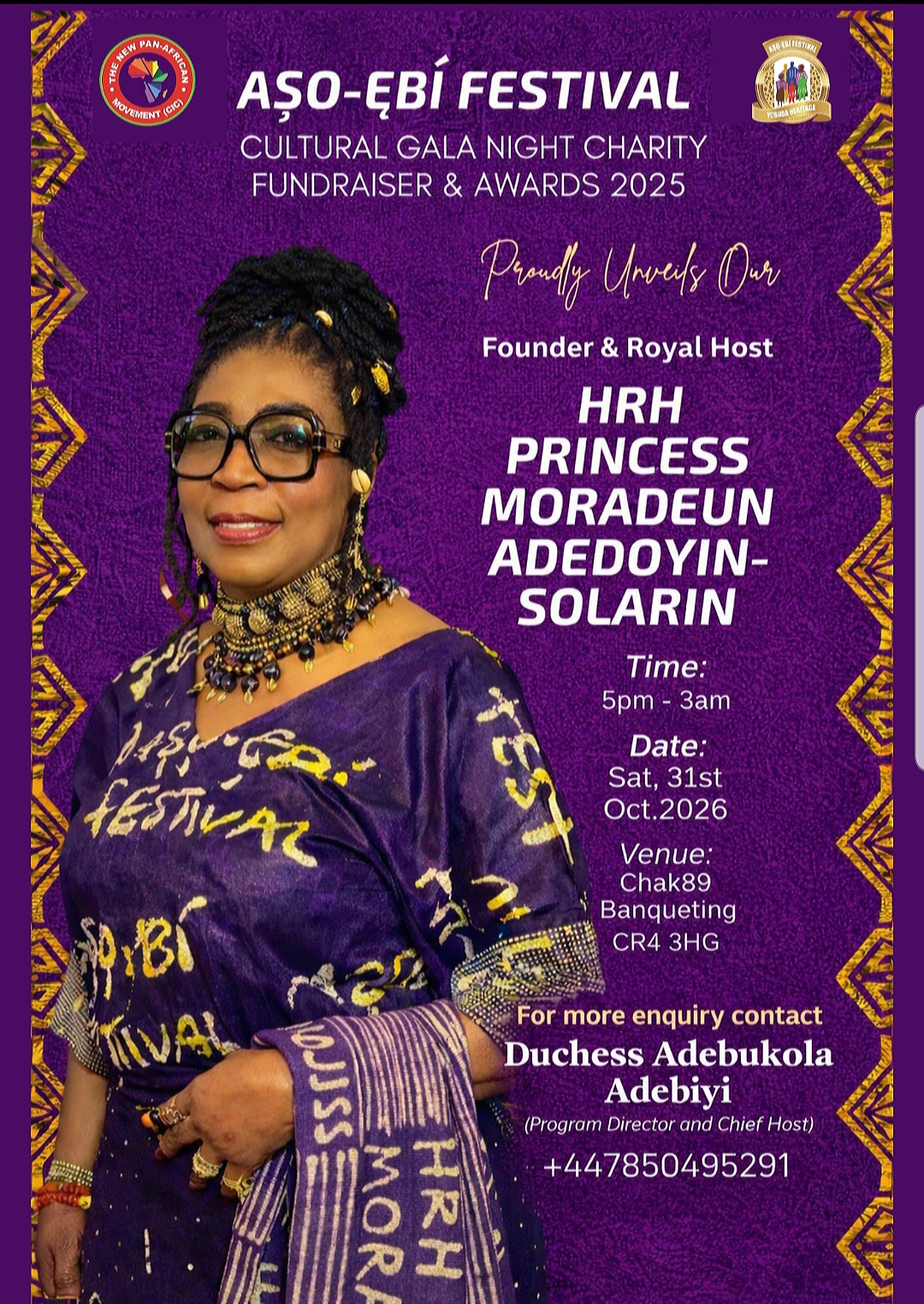 Step into a vibrant tapestry of culture and tradition at the AŞO-ĘBÍ Festival Cultural Charity Gala Night & Awards, Organised by HRH Princess Moradeun Adedoyin-Solarin & her New Pan-African Movement(CIC) NPAM Team.
