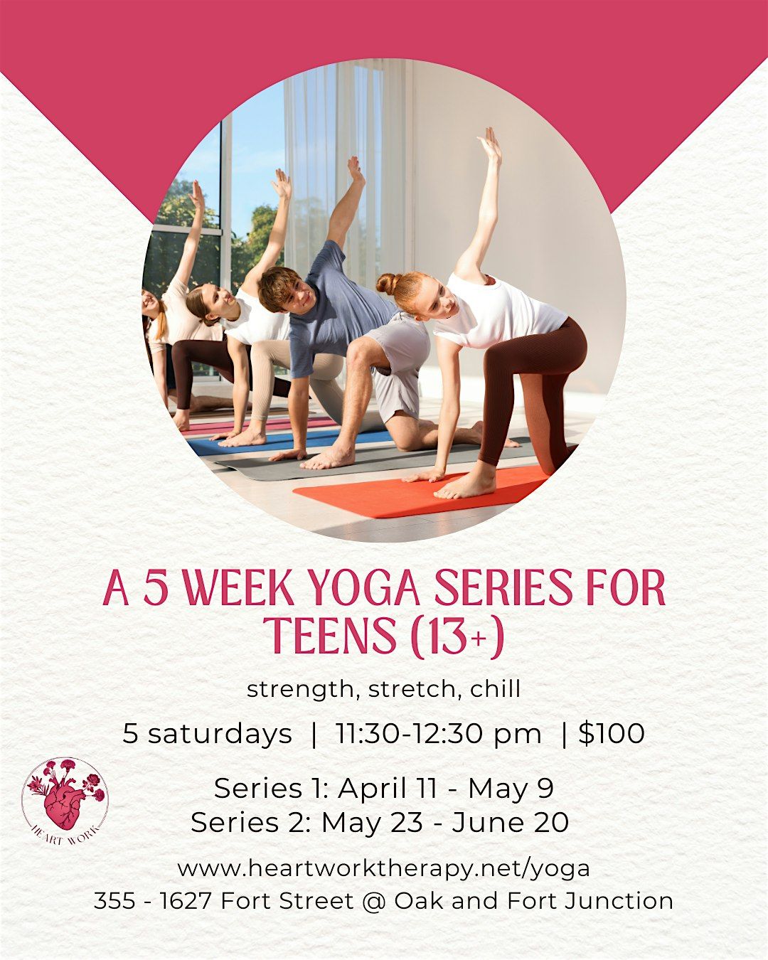 A yoga class created just for teens to move, breathe, and release the stress from the week. This class blends elements of strength, flexibility, and mindfulness to help teens feel stronger in their bodies and calmer in their minds.