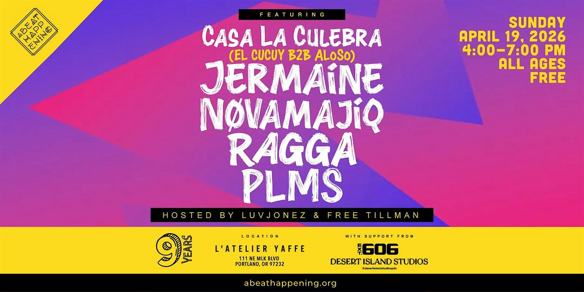 The April showcase and concert of all Portland-based talent will feature DJ sets, beat sets, and performances by CASA LE CULEBRA (DJ EL CUCUY AND ALoSo), JERMAINE, NOVAMAJIQ, RAGGA, and PLMS. In partnership with Portland Plays Together, L'Atelier Yaffe, in celebration of the FIFA World Cup 2026.