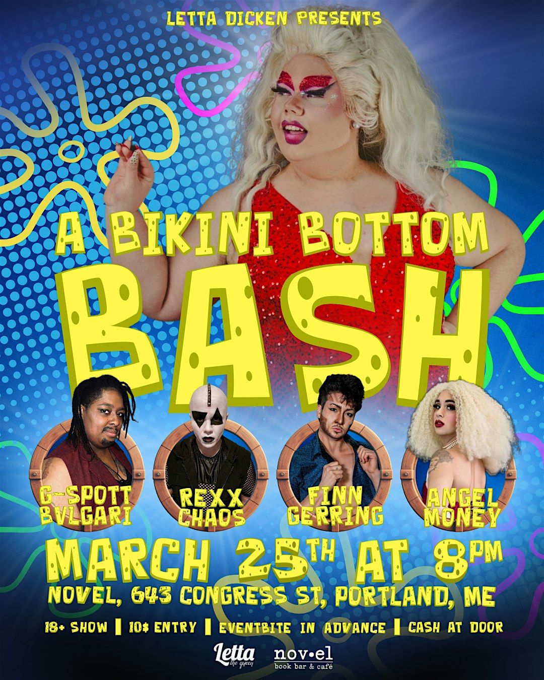 Who lives in a Fagapple Under the Sea? Spongeboob the Drag Sponge! Aye aye captain, so sail on down to Novel for A Bikini Bottom Bash, a Spoungbob Squre Pants inspired Drag Show. Hosted by Letta Dicken featuring your goofy goobers, G-Spott Bvlgari, Rexx Chaos, Finn Gerring, & Angel Dionne Money.
