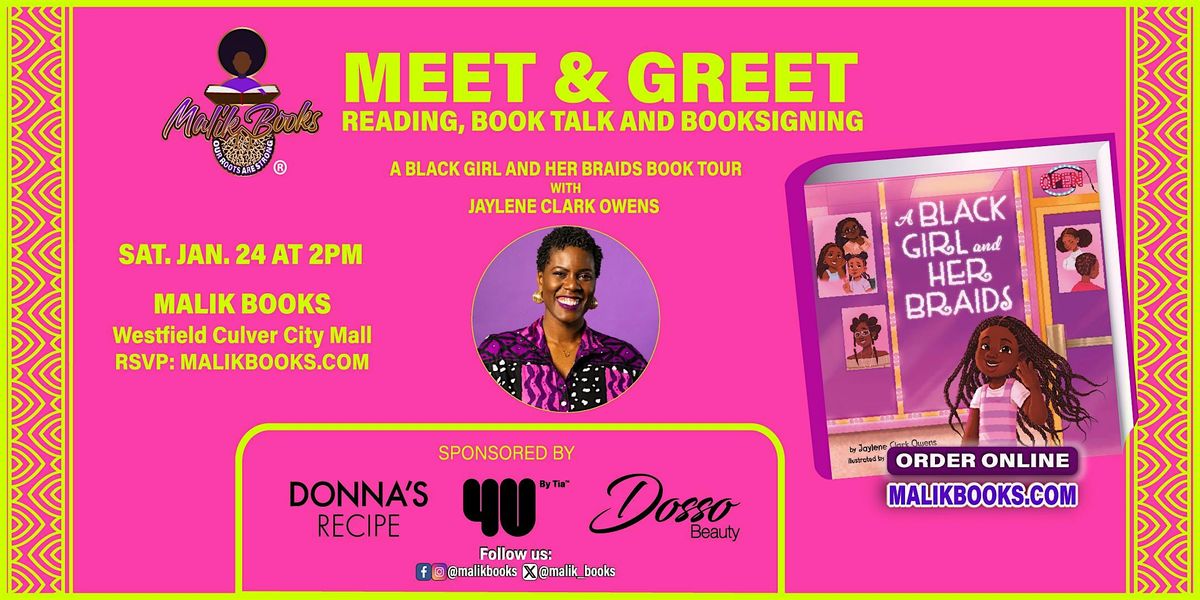 Malik Books (Westfield Culver City Mall) proudly presents A Black Girl and Her Braids on January 24, 2024 at 2PM a joyful and affirming literary celebration honoring Black girls, their hair, and the cultural legacy of braids.