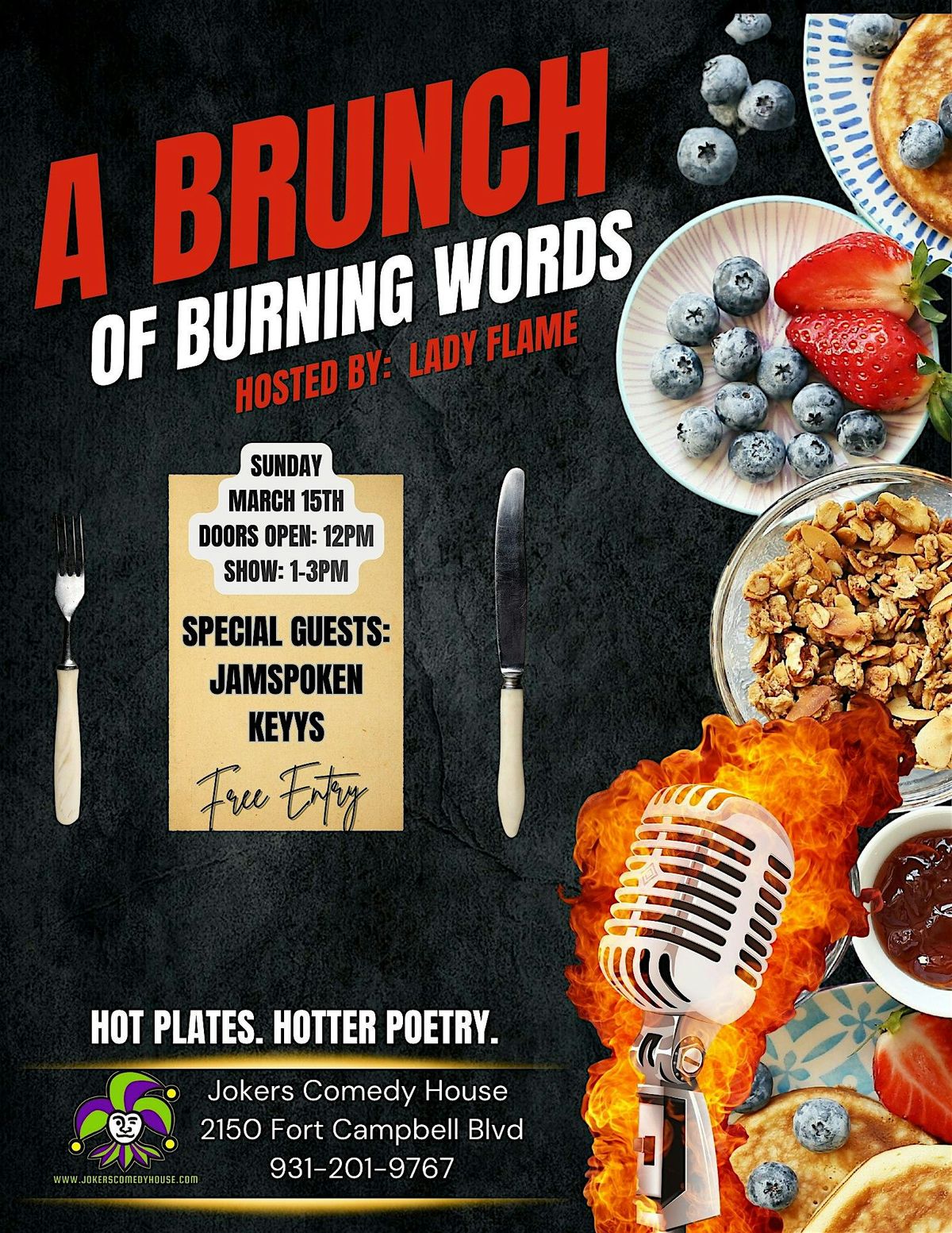 Welcome to A Brunch of Burning Words at Joker's Comedy House ! Get ready for a mid morning full of soulful poetry on March 15, 2026 at 12:00 PM (Central Time). Join us for a unique experience where words are added to your plate. Don't miss out on this opportunity to enjoy delicious food, great company, and truth through poetic storytelling. Grab your friends and family for a memorable event that will leave you FIRED UP & full.