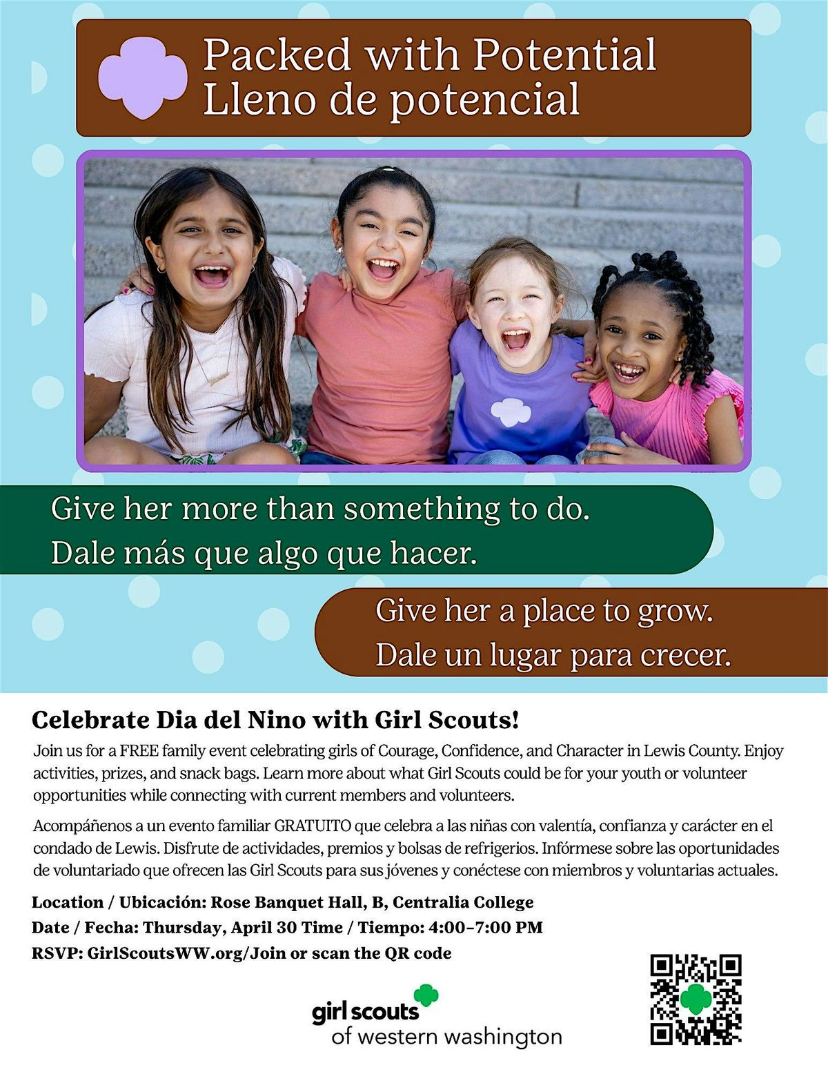 Acompáñenos a un evento familiar GRATUITO que celebra a las niñas con valentía, confianza y carácter en el condado de Lewis. Disfrute de actividades, premios y bolsas de refrigerios. Infórmese sobre las oportunidades de voluntariado que ofrecen las Girl Scouts para sus jóvenes y conéctese con miembros y voluntarias actuales.
