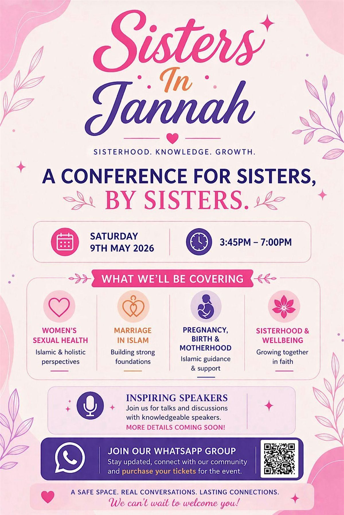 A welcoming space where we can grow in our deen, connect with one another, and have real, honest conversations. It’s a chance to step away from the noise and be surrounded by sisters who are all striving for the sake of Allah, building meaningful connections and supporting one another. The event will cover important and often unspoken topics like women’s sexual health, marriage in Islam, pregnancy, birth and motherhood, and overall wellbeing, all shared in a way that is both Islamically grounded and relatable to everyday life. Through engaging talks and discussions, you’ll leave feeling more connected to your faith, more understood, and part of a genuine sisterhood, with opportunities to stay connected and continue the journey together beyond the event.