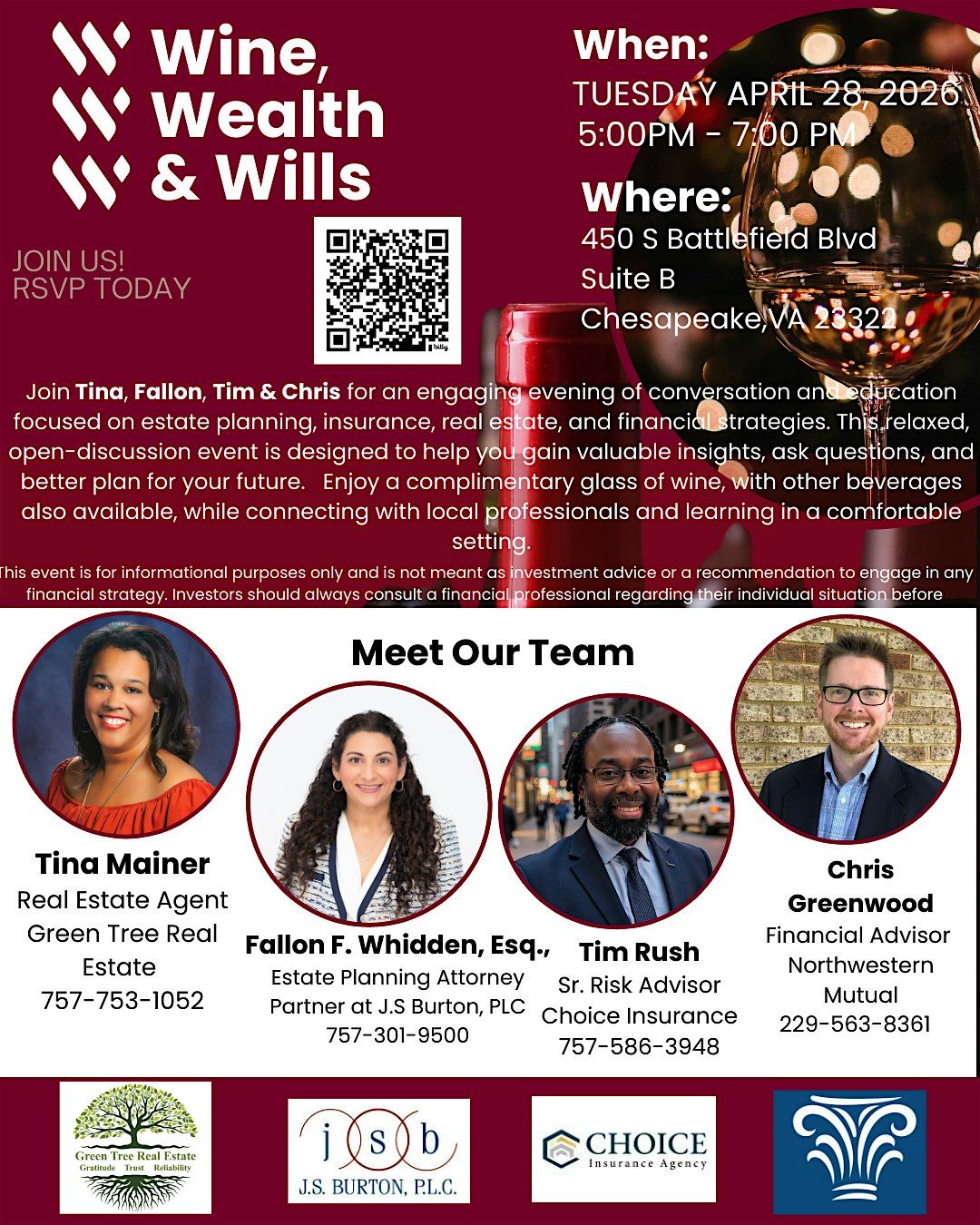 π· Welcome to Wine, Wealth & Wills!Join us in Chesapeake for an evening of learning, sipping, and connecting.
