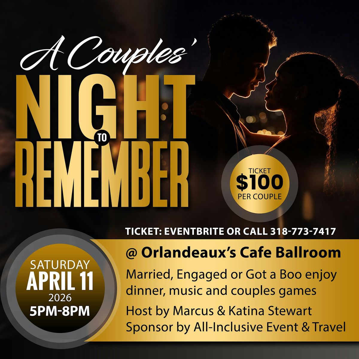 Invest in your love, married couples, engaged couples and girlfriend and boyfriend. Enjoy food, music and fun couples games.