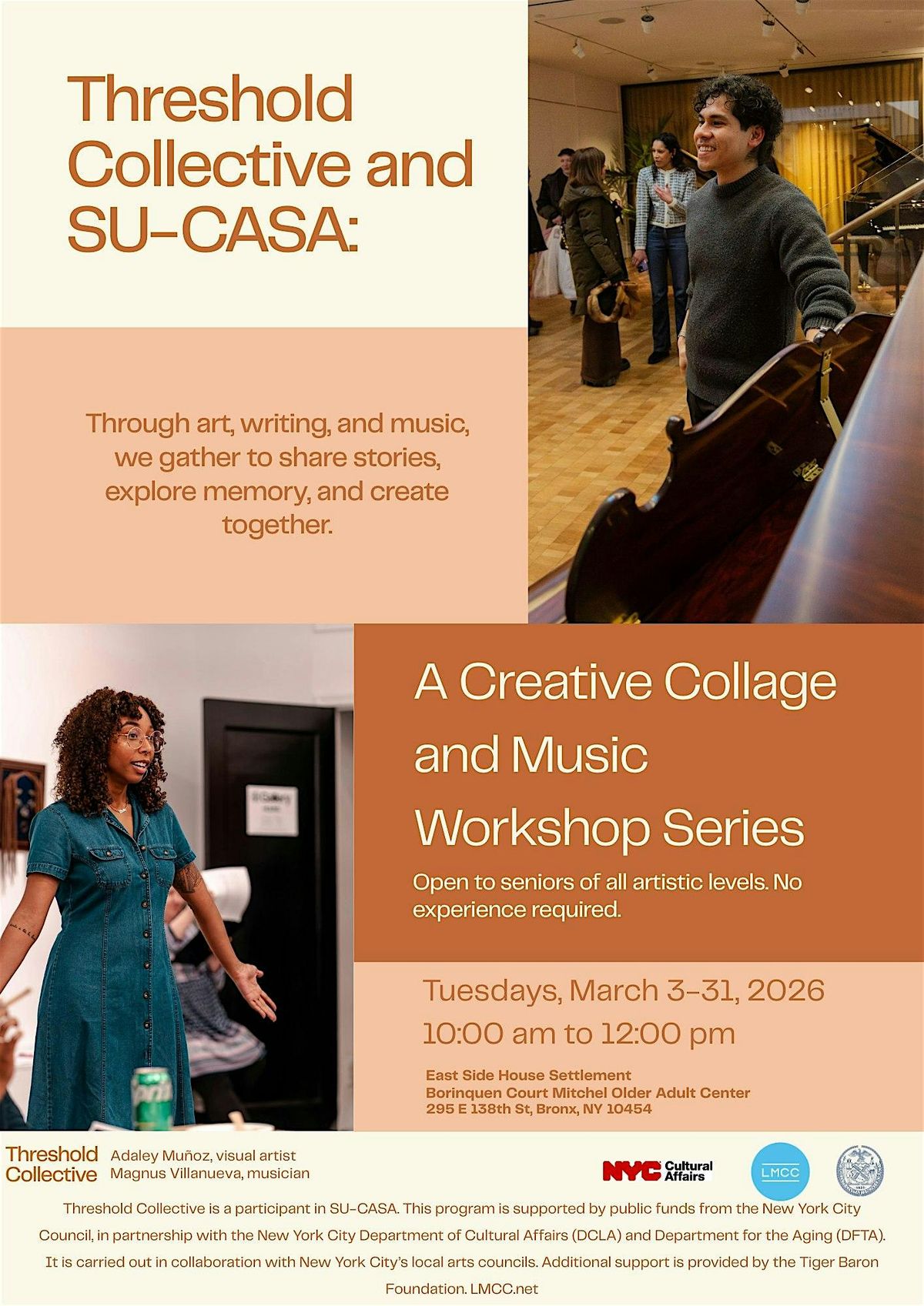 An interdisciplinary arts workshop series (sound, writing, and visual art) for older adults at East Side House Settlement’s Borinquen Court Mitchel Center in the Bronx. Participants create journals, collages, and gouache paintings using guided prompts, curated music listening, and projected artworks. Materials include paper, magazines, pens, glue, and gouache. Goal: build creative confidence by translating memory into art.