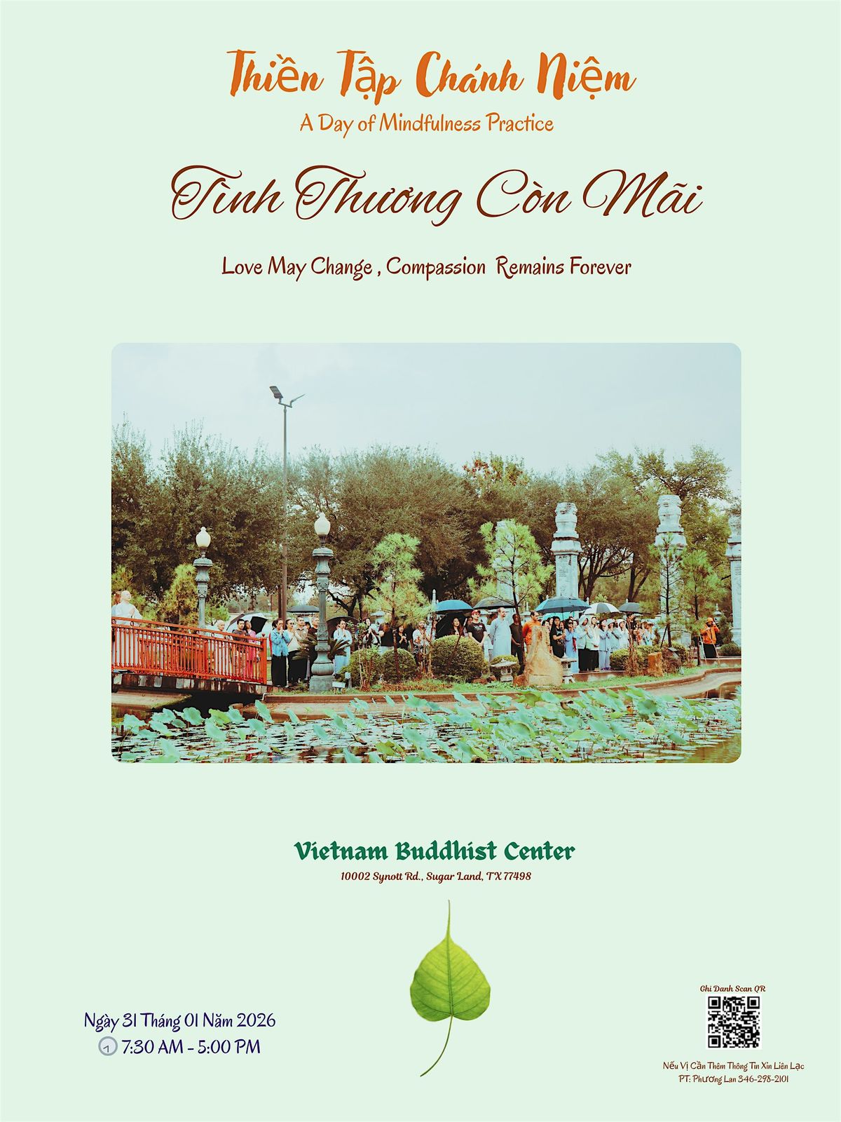 On the occasion of the early days of the New Year 2026 and the closing days of the lunar year, we warmly invite you to join us A Day of Mindfulness Practice conducted in Vietnamese with English Translationon Saturday, January 31, 2026, from 7:30 am to 5:00 pm with the theme "Love May Change, Yet Compassion Remains."