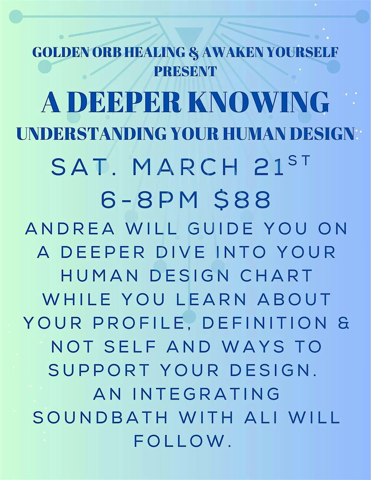 Join us for an exploration of your Human Design Chart and learn how to make your design work for you. Information unique to your design is included. Be sure to email your birth date, time, and place to [email protected]
