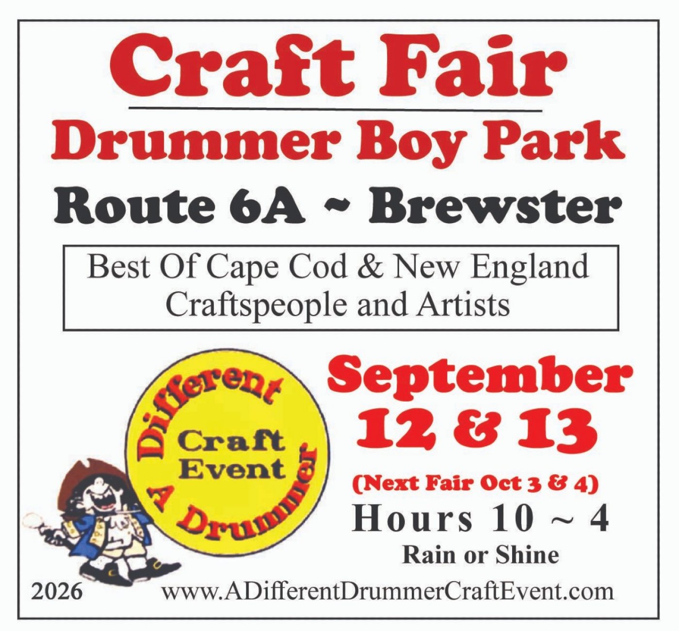 The craft fair is Saturday and Sunday, September 12 and 13 at Drummer Boy Park, 773 Old Kings Highway on Route 6A in Brewster. Hours 10 to 4, rain or shine, A Different Drummer Craft Fair will be there.