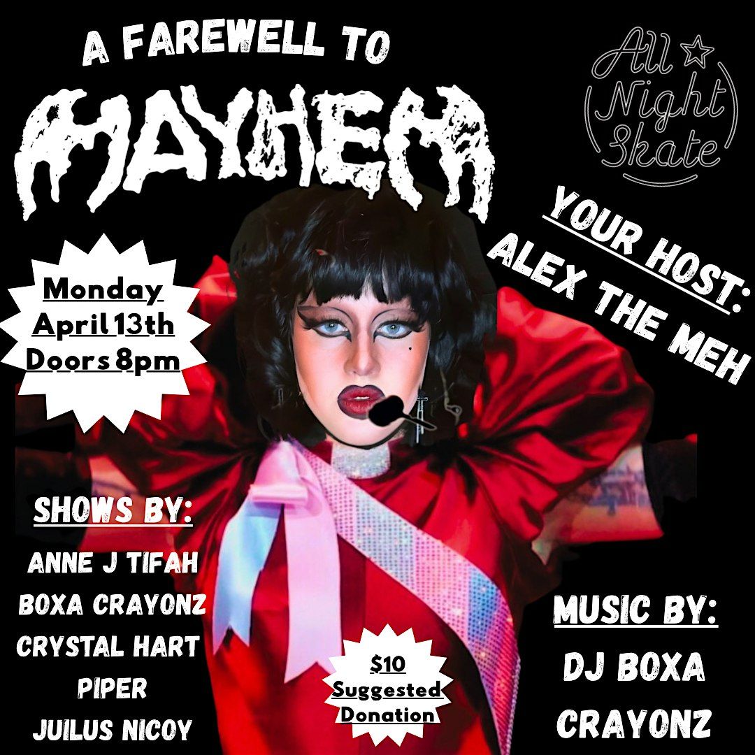 Join us for an unforgettable in-person night filled with wild vibes and killer tunes at A Mayhem Show/party. It's your last chance to experience the chaos, fun, and energy all under one roof. Bring your crew, dance your heart out, and say goodbye to the madness in style. Don’t miss out—let's make some memories before the mayhem fades away!