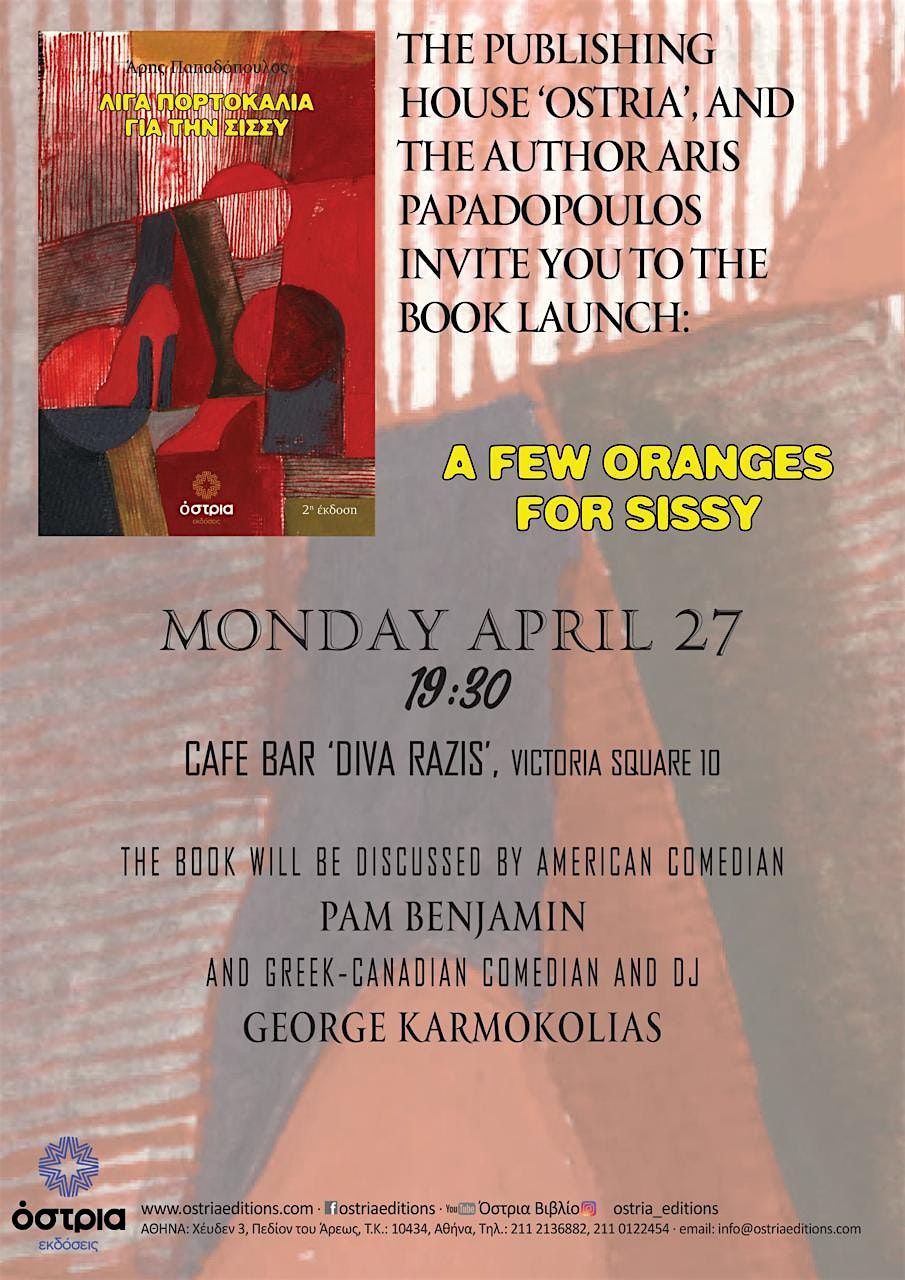 Join your international friends from Mutiny Radio at Diva Razis Victoria Square 10-12 for the English book launch of "A Few Oranges for Sissy" written by Aris Papadopoulos with readings from the book by George Karmokolias and Pam Benjamin. Monday night April 27th starting at 7:30pm you'll experience excerpts from this historical Greek memoir about Sissy, a sex worker in Athens during the 70's.