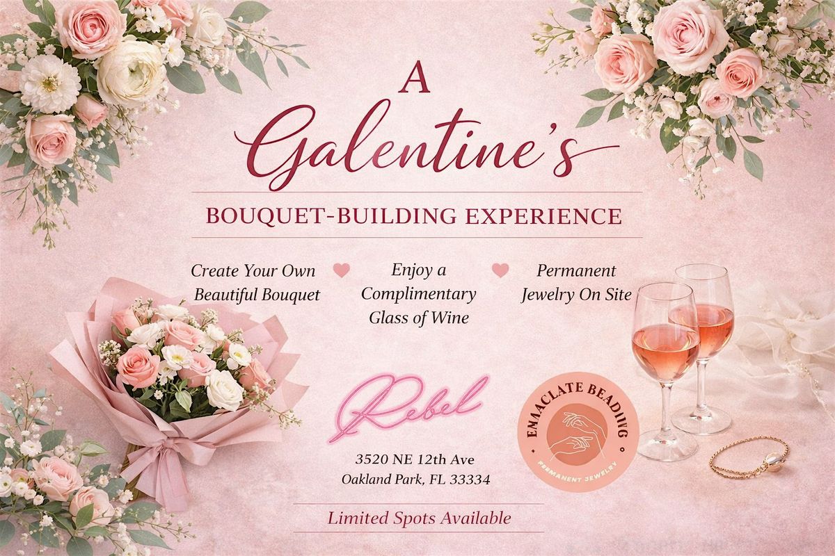 Galentine’s at Rebel Wine Bar: learn bouquet-building, all materials included, take home your flowers, enjoy wine & permanent jewelry.”