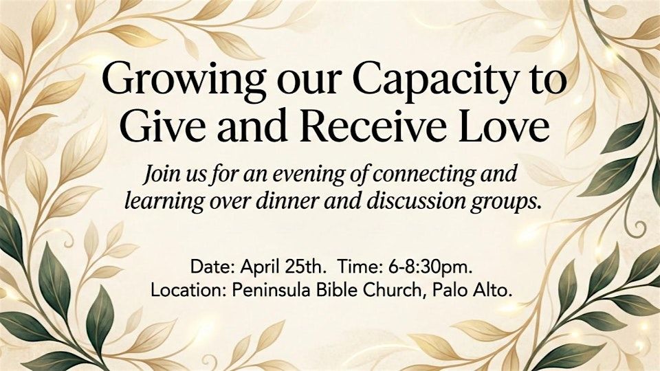 God has designed us to be a people of love. Join us as learn and discuss how to grow our friendship, romance, and sacrificial love muscles in community. Our speaker will be Rob Schulze, Community Pastor of Peninsula Bible Church. Attendees will also be invited to join future gatherings and a eight week summer class at PBC-- How We Love. How We Love walks us through our unique love styles based on our early attachment and explores how we can better give and receive love through knowing our style and thre style of others.