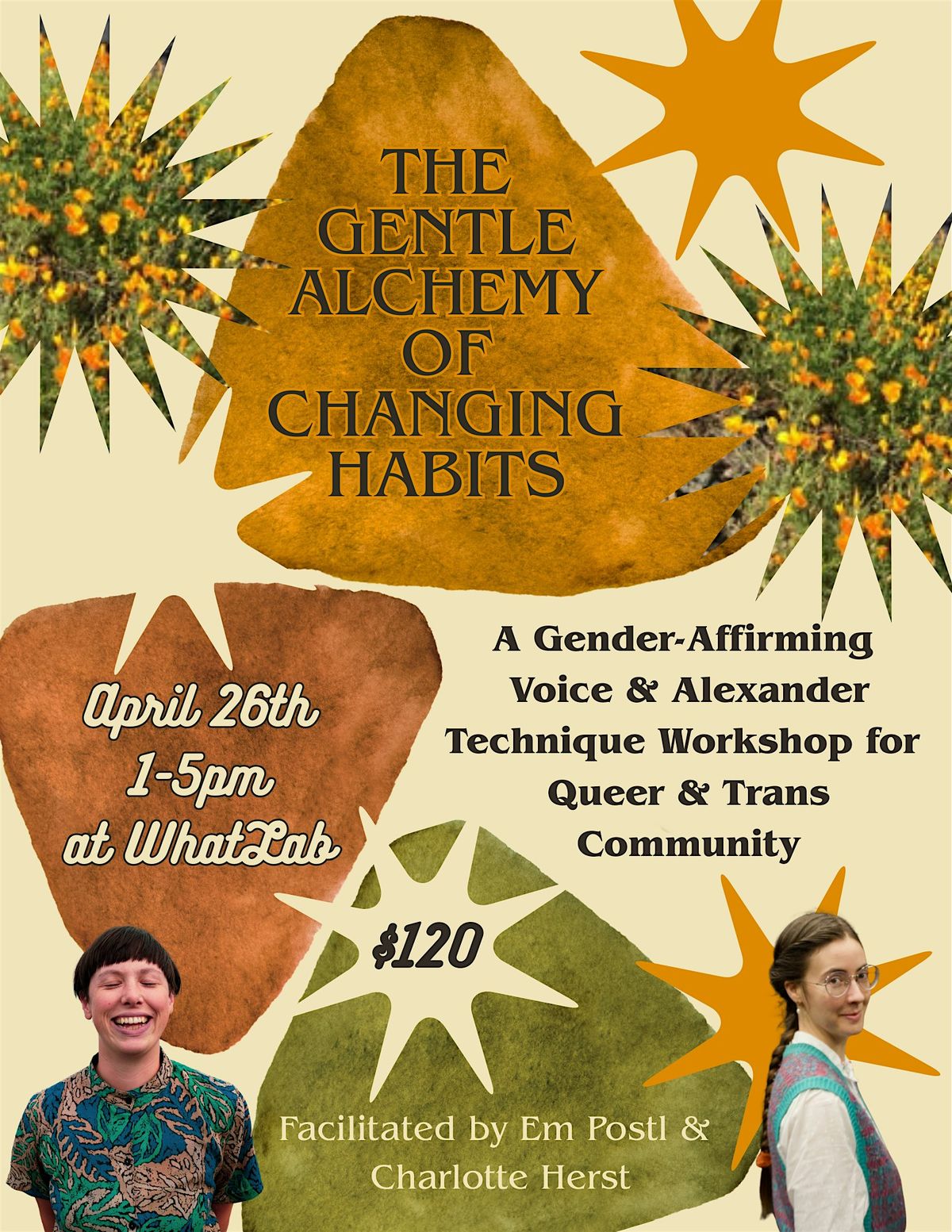 What to expect: In a small, supportive group we’ll build foundations for gender-affirming voice work, vocal health, nervous system resilience, and make some weird sounds together. Through experiential movement and vocalization, we’ll gently explore our habits of speaking, sitting, standing, and walking in the real life context of our social habits. Using the AT process we’ll improve our observation skills, so that we can notice the habits we’ve come to rely on, while playfully supporting and opening up different ways of being, moving and sounding.