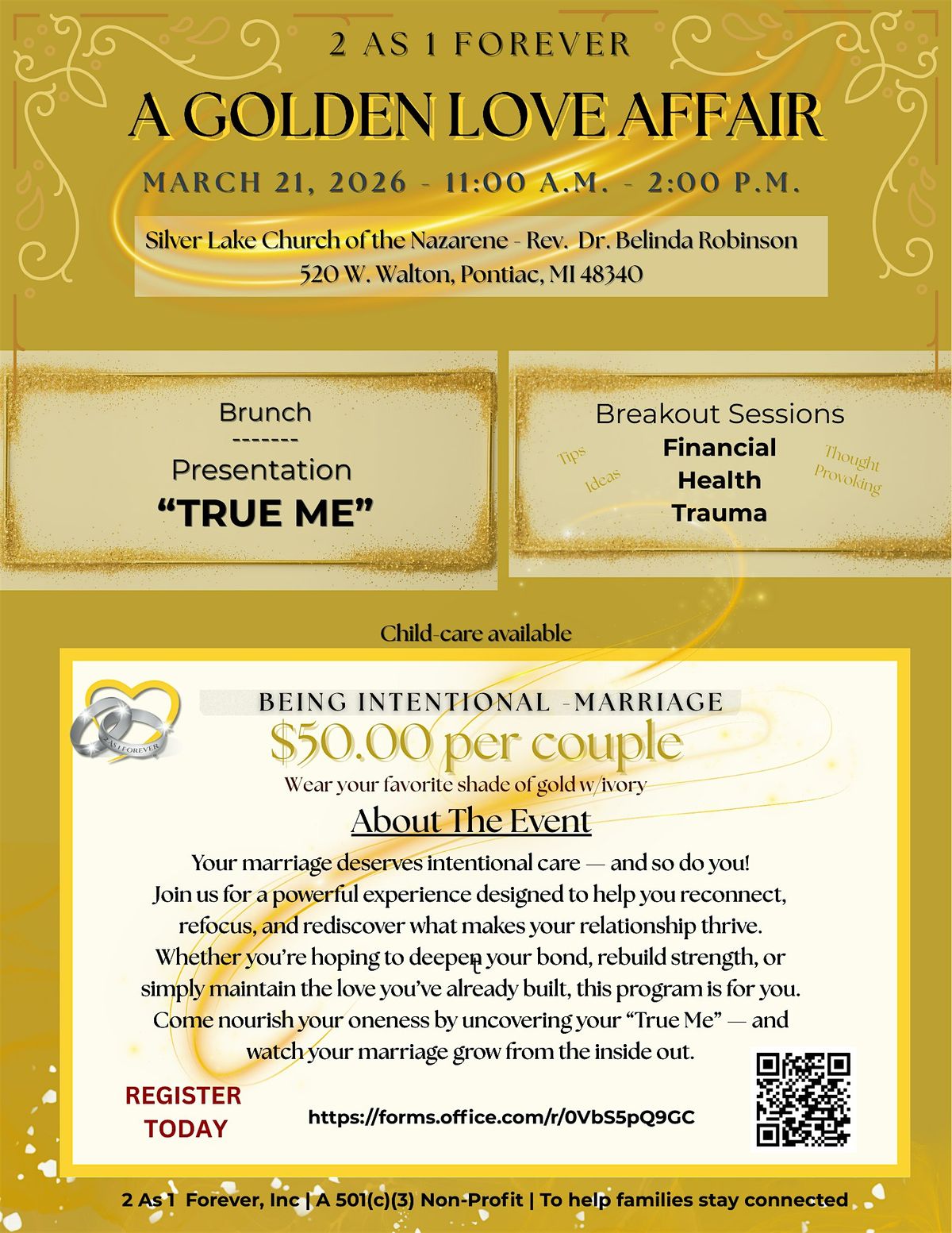 Join us in person for A Golden Love Affair where we'll dive into what it means to be intentional in your marriage. It's all about strengthening your bond, having fun, and learning how to keep the love alive with purpose. Don't miss out on this cozy, heartfelt gathering designed just for couples who want to grow together! Brunch is included. Child-care available ages 2-11(no charge - PAL - Pontiac Athletic League) - contact us: [email protected]