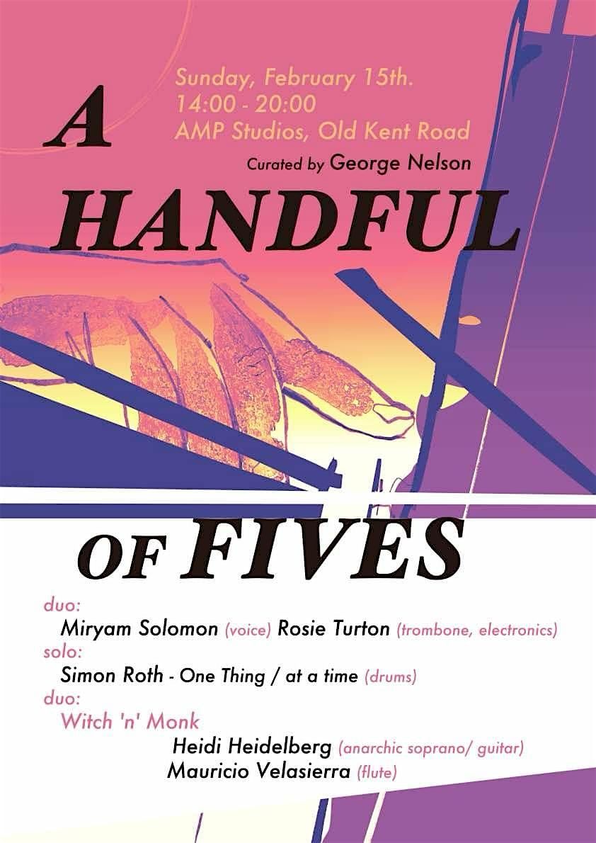 George Nelson's A Handful of Fives riffs of the five-musician format of his All Party Parliamentary winning Moment's Notice, only this time in established combos/solos and in any feasible configuration of five ( a trio and two solos, a quartet and a solo, a trio and a duo etc). So, hypothetically you might get Run The Jewels with The Carpenters and Matana Roberts (duo, duo, solo). Last year we had An Alien Called Harmony (trio) Kadialy (solo) Saied Silbak (solo).