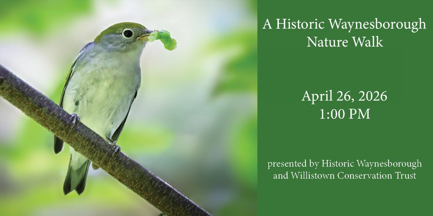 Did you know that there was a creek on the property of Historic Waynesborough? Blake Goll and Lauren McGrath from the Willistown Conservation Trust will lead you on a nature walk to Waynesborough Run and share information about the watershed and birding in the area. Bring binoculars and sturdy shoes.
